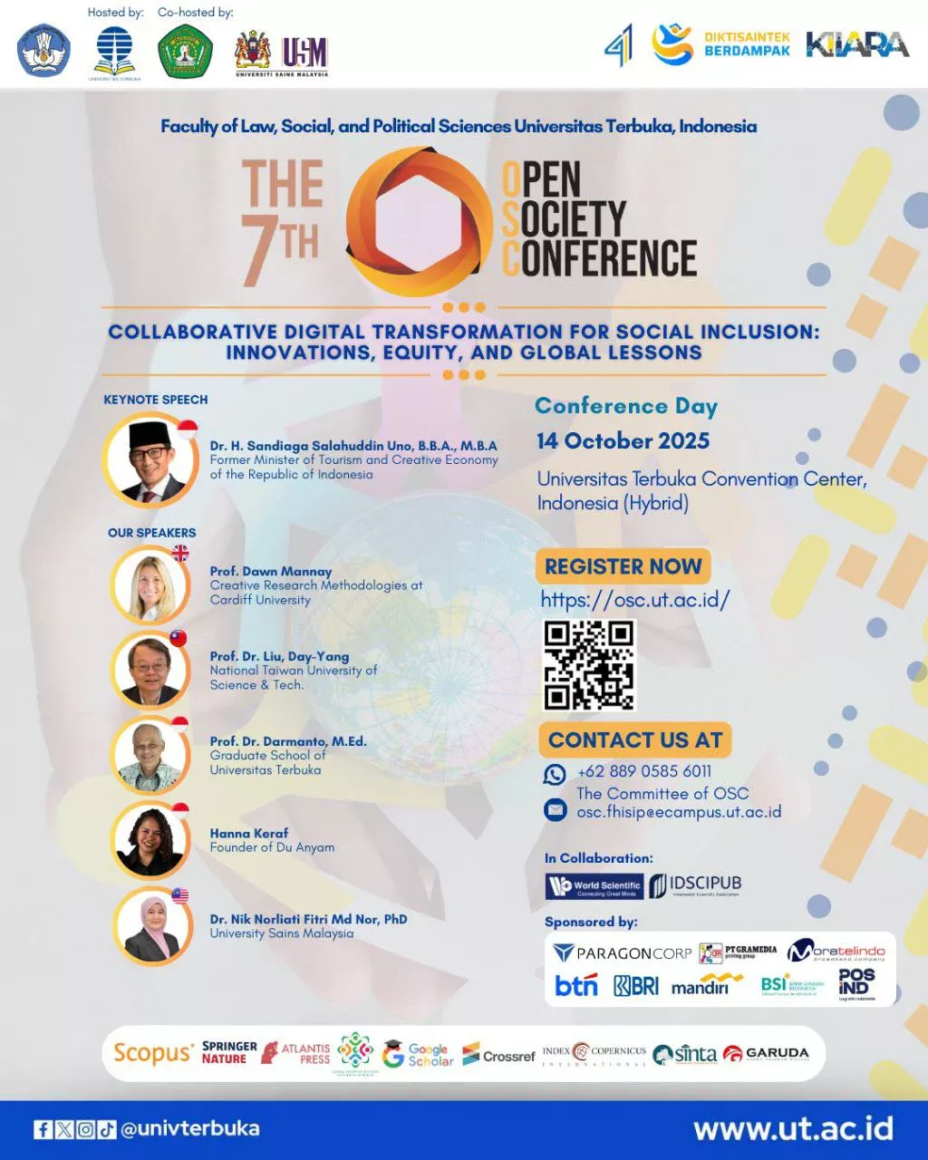 The Open Society Conference is the annual conference hosted by the Faculty of Law, Social, and Political Sciences, Universitas Terbuka, Indonesia. The conference has been held 6 times, starting from a national conference, and escalating into an international conference. This is a place for academicians, students, researchers, practitioners, and policymakers to disseminate the research. We also invited speakers either academicians or professionals for sharing and exchange knowledge.